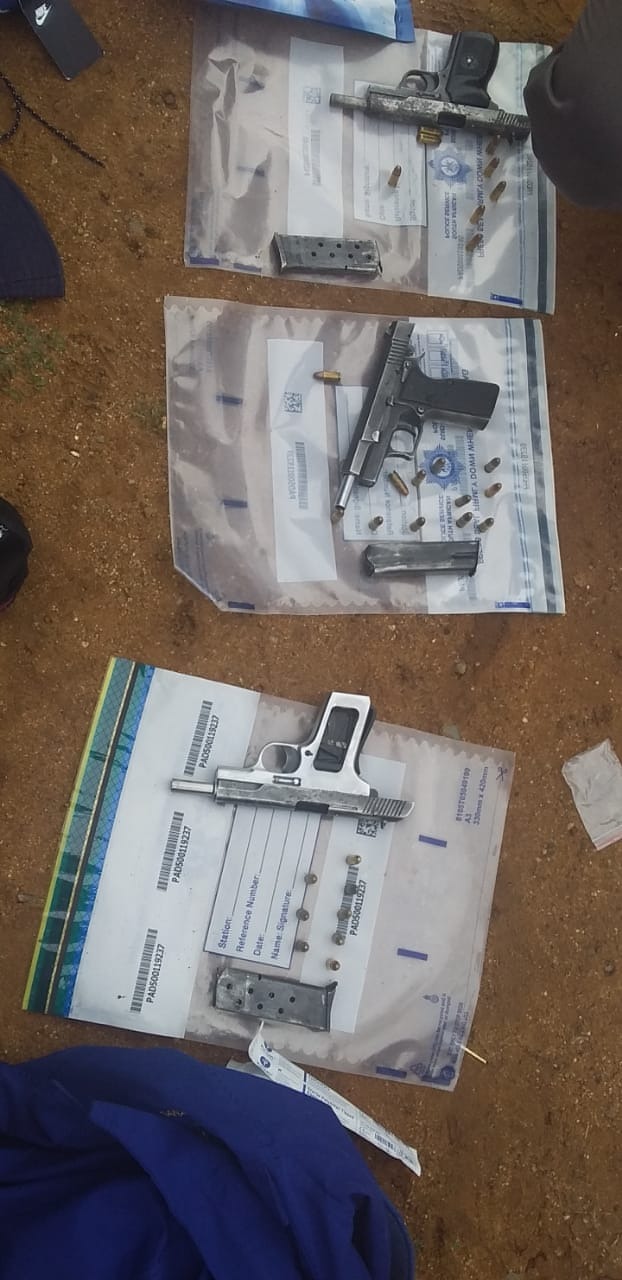 An intelligence-led operation following a robbery of a courier van earlier in the day in Toekomsrus, saw police pounce on the three suspects who were sitting in a BMW car, parked in a yard in Segaetsho Street in Mohlakeng. Upon searching the suspects and their vehicle, the members found three firearms with erased serial numbers, three magazines, and live ammunition.