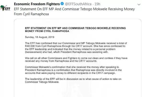 “The aunt of Mokwele and her husband were shot dead in a situation that was believed to be a robbery and President Ramaphosa gave her the R40 000 as a condolence. This comes to us as a confirmation that Ramaphosa had a direct knowledge because the money came from a CR17 account, this is two years or so later the money came in on a situation that happened this year and Ramaphosa has been saying the money of his campaign he didn’t know anything about this. But this is evidence that he was very aware and he could even give instruction for money to be delivered from those accounts.”