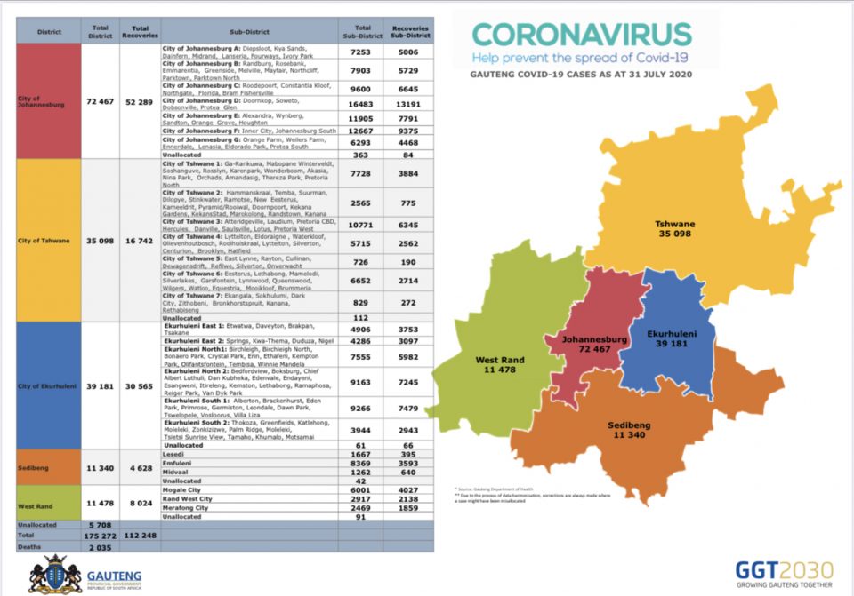 NewsGauteng confirmed COVID-19 cases district breakdown by Gauteng News ReporterAugust 1, 2020August 1, 2020 Share1 The total number of confirmed COVID-19 cases in Gauteng as at 30 July 2020 sits at 171 574, with 110 016 recoveries and 1932 deaths.