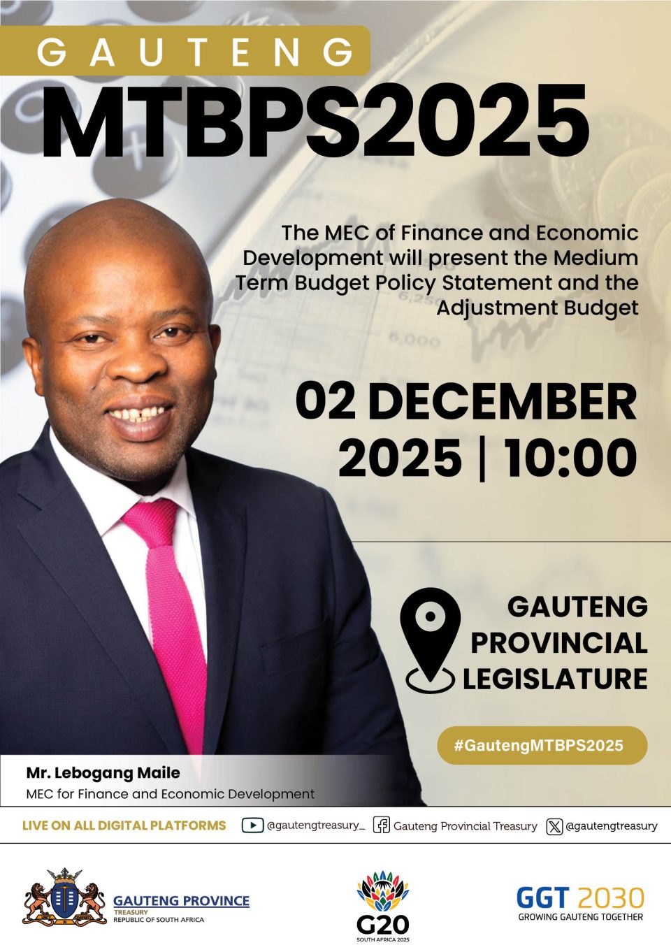 Gauteng is preparing for one of the most important moments in its provincial financial calendar as MEC for Finance and Economic Development, Mr. Lebogang Maile, is set to table the 2025 Medium Term Budget Policy Statement (MTBPS) along with the Adjustment Budget. The presentation will take place on 02 December 2025 at 10:00 at the Gauteng Provincial Legislature.
