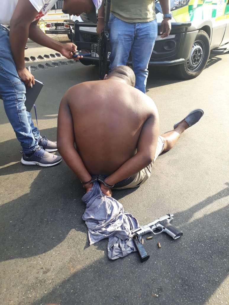 SAPS in conjunction with the JMPD arrested a 28-year-old male suspect for murder, three attempted murders, possession of an unlicensed and ammunition at corner Noord and End Streets.