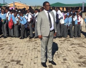 Picture caption: MEC Panyaza Lesufi addressing learners at menzi primary school following a break in.