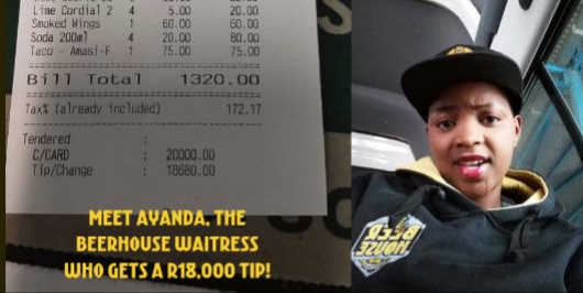 A waitress at the Beerhouse in Fourways, Ayanda had received a tip of R18, 680- on a bill of R1 320. The restaurant reported on its website.
